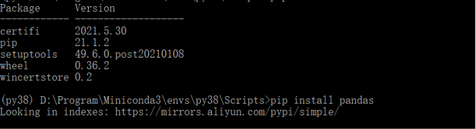 先cd到相应目录下,输入命令 “conda install 包名称 ”或者直接用“pip install 包名称”来安装第三方包到该环境下,这里我安装pandas包到相应路径下。