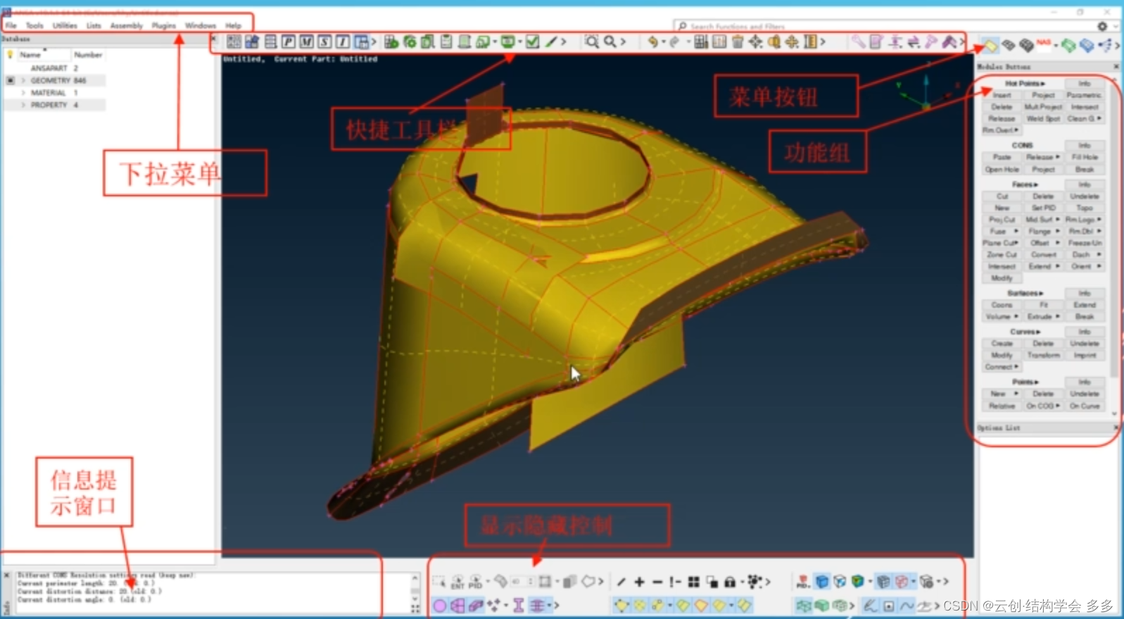 主页面大致分为6个区块:菜单,快捷工具栏,菜单按钮,功能组,信息提示窗口,显示隐藏控制。每一个区块都有着不同的功能,各个区块相互配合才能构成了功能强大的ANSA。</