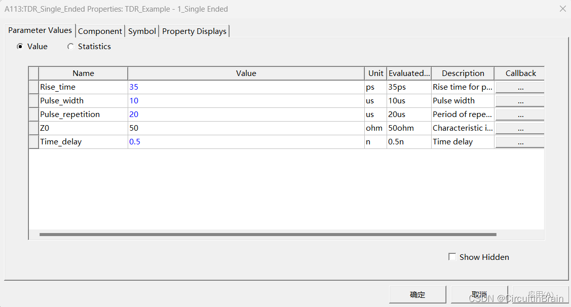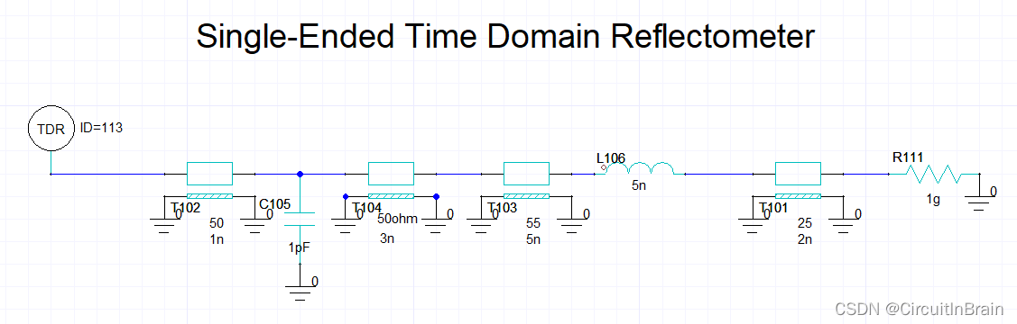 打开Ansys的TDR电路 例程 ,单端电路和TDR源的设置如下图所示,被测的DUT为4段传输线和一个电容,一个电感。