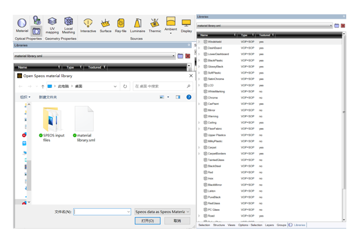 1.在一个新仿真项目中,点击 optical properties 的 libraries 选项,open library 选择创建的 material library,加入列表。