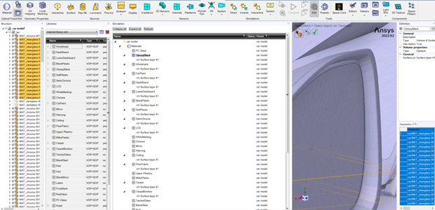 2.在 3D 视图或结构树中,如果应用体积/表面光学属性材料,请选择一个或多个物体,如果应用一个面光学属性材料,选择一个或多个面,在 Libraries 面板中,从打开的材质库中,右键单击相应的材质(VOP/SOP或FOP),然后单击 Apply material to geometry,快速完成材料属性的定义。
