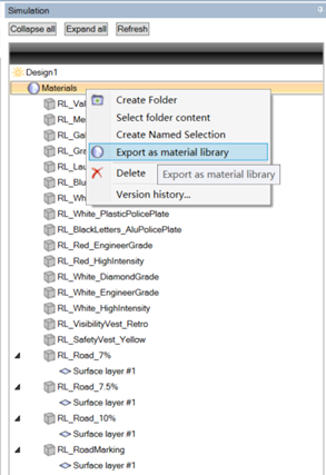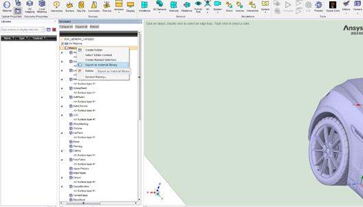 2.在 Speos Simulation 树中,从仿真项目中导出所有材料,右键单击材料 material,或是从仿真项目中导出一些材料,选择想要的材料,然后右键单击创建材料库 export as material library。