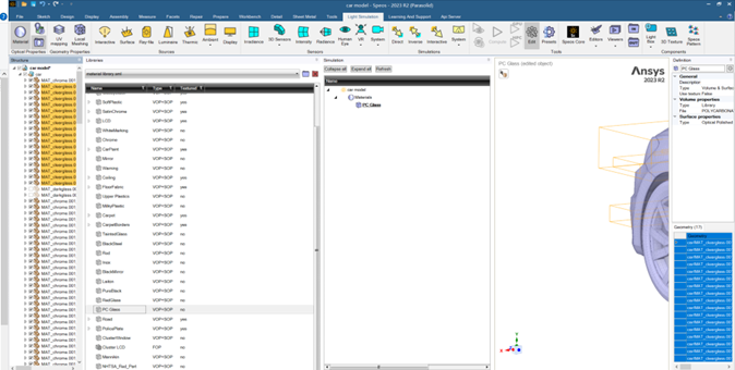 Speos 在不断更新细节功能的同时,不断地优化材料属性应用过程,旨在帮助用户在相同的项目或是不同的项目之间通用材料属性定义,甚至扩展到公司内部不同的设计人员之间数据的通用,减少光学材料属性定义花费时间,提升工作效率。Material library 可以将材料属性编辑为 *.sml 文件,该文件包含材料属性的命名列表,并且每个定义材料都链接材料属性,使用仅需点击应用材料到几何体即可完成材料属性的定义,简化项目准备工作,更快速管理替换材料。