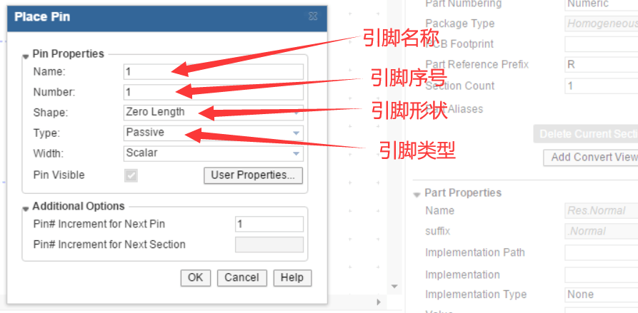弹出 引脚 设置界面,输入引脚名称,引脚序号,引脚形状,引脚类型。引脚名称可以是数字或母;引脚序号非常关键,需要和之后的PCB封装的引脚一一对应,可以是数字或字母;引脚形状可以由自己选择,这里电阻选择没有长度的引脚;引脚 类 型选择默认的【Passive】即可