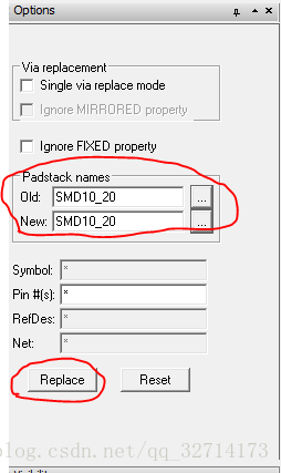 选择Tools--Padstack--Replace,右侧的Option菜单即出现如下图所示的画面: