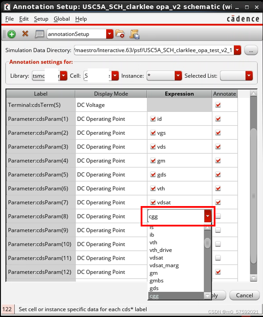 如果当前显示的 信息 不包含我们关心的参数或者我们想关注gm、Cgd、Cgg等其他mos管参数时,可以通过在器件上右键,选择annotations--setup,会弹出如下窗口: