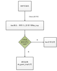 Xen系统中绝大部分硬件设备产生的中断最终都由Guest OS处理,但由于Domain不能直接访问这些硬件设备,来自设备的中断须要经过分发才能被Guest OS接收并进行处理,因而比Linux系统,Xen系统中处理中断要相对复杂,主要体现在Xen在获得外部中断后如何正确发送给相应的Guest OS,并找到正确的中断处理程序。VIDT(Virtual Interrupt Descriptor Table,虚拟中断向量表),Guest OS的异常处理过程如下: