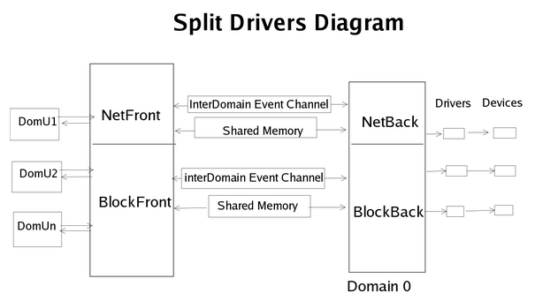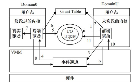 一个设备的驱动存在于Domain 0中,同时有一个虚拟驱动分成前端驱动和后端驱动,分别存在于虚拟机和Domain 0中。一个虚拟机的I/O访问为,虚拟机的前端驱动和Domain 0的相应后端驱动通信,后端驱动再传输数据给相应的本地设备驱动,通过本地设备驱动来对物理设备进行访问和控制。