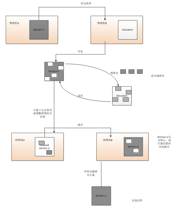 热迁移基于基本的save和restore思想来实现,只是所在虚拟机只有在迁移拷贝最后的内存块时才需要休眠,同时该虚拟机在另外的物理机上可以快速地恢复。具体过程如下: