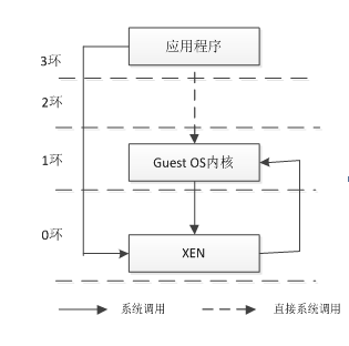 Hypervisor是Xen提供给客户系统的交互界面,客户系统通过hypercall存取硬件资源,根据Xen的安全模型,Xen运行在ring0层,而Guest OS运行在ring1层,App运行在ring3层,不同类型的Guest OS不同方式调用Hypercall。