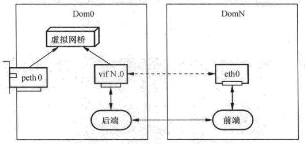 虚拟网络设备包括位于Dom0的后端和位于DomN的前端,同时前、后端需要通过共享内存进行通信,由于后端需要支持多个前端设备,所以后端具有网桥功能。在每一次DomN启动时,创建了前端设备eth0,此时在Dom0中为其创建相应的后端设备vif N.x,其中N是domain的ID,x是DomN的第x个网络设备,第一个网络设备就是vif N.0