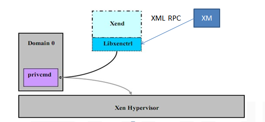 Libxenctrl是一个C语言的库,它为Xend提供与Xen Hypervisor通信的能力。privcmd是Domain 0中的一个特殊驱动,它负责提交请求到hypervisor。