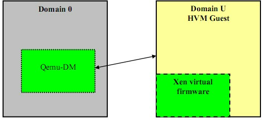 Domain 0里为每一个HVM Guest启动一个特殊守护进程:Qemu-dm,由Qemu-dm负责客户操作系统的网络和磁盘请求。Domain U HVM Guests必须进行初始化为某类机器,所以要在Domain U上附加一个软件:Xen虚拟固件,来模拟BIOS
