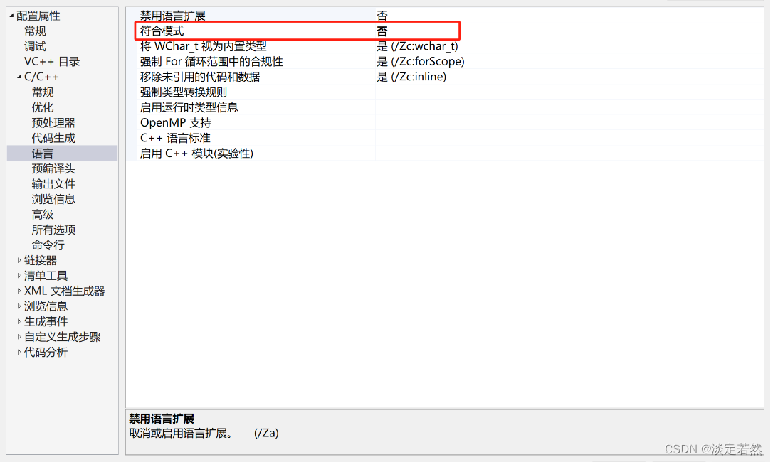 /permissive-:启用所有严格标准符合性编译器选项,并禁用大部分特定于 Microsoft 的编译器扩展(但有一些例外,比如 __declspec(dllimport))。 在 VS2019 版中此选项默认为开启状态。 /permissive- 符合性模式包括对两阶段名称查找的支持。