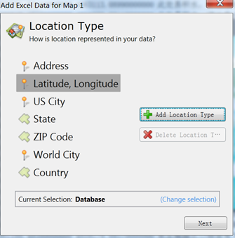 (2)弹出添加数据对话框,需要选择数据采用的位置类型。本数据采用的是经纬度坐标,因为选择第二项。也可以通过手动添加方式选择企业自定义的位置类型。