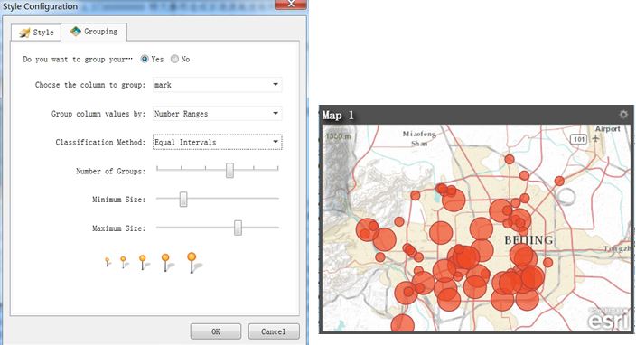 也许你觉得上图中的符号不够美观,或者这种单一符号不能满足需求,那maps for office提供了符号渲染功能。该怎么做呢?很简单,在工具栏或者右键单击内容目录中的数据图层,选择style或grouping按钮或菜单。弹出类型配置对话框。