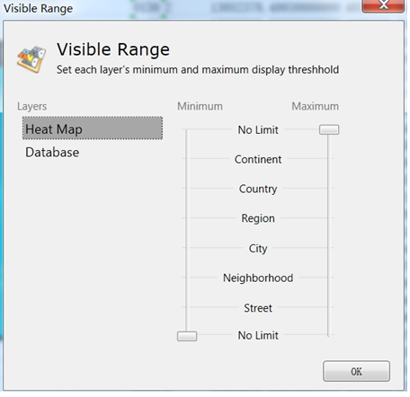 在某些场景下,有些数据在某个比例尺范围内才显示,maps for office提供了该功能。