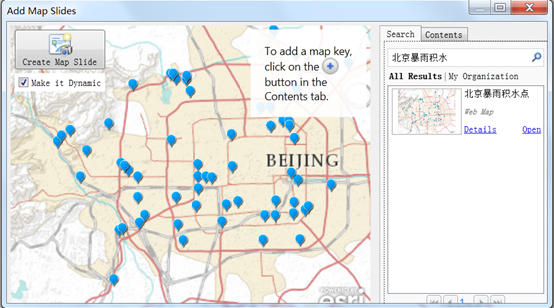 同样的需要使用online账户登录。然后点击Add Map Slides 。弹出add map slide对话框窗体。现在我们要做的,就是通过search方式,将我们之前共享在online上的地图添加到地图上。在search栏中输入共享的地图名称或其他关键字,找到之后,点击open将地图添加进来。如下图所示。