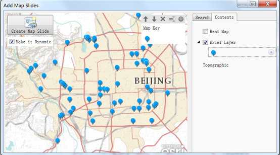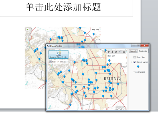 设置完成后,接下来我们就要创建地图幻灯片了。点击Create Map Slide(对话框左上角位置),如果是要使用动态交互地图,请确保选中Make it Dynamic复选框。此时我们看幻灯片中已经添加了一张地图幻灯片。关闭Add Map Slide。