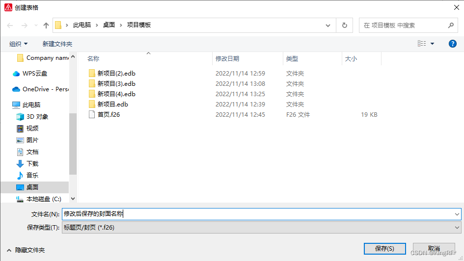 点击打开后,弹出创建表格对话框,选择新封面页的存放位置和填写封面页名称后,点击保存。