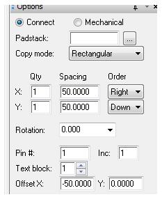 这些问题都解决了之后,就可以开始绘制封装了,首先确定个管脚相对于中心点的位置坐标,然后选择Layout -> pins,还有一个option选项,如下图,详细介绍一下该选项的使用方法。