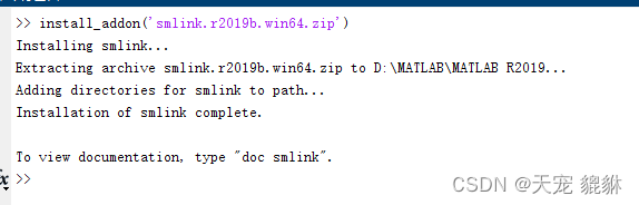 install_addon(‘smlink.r2019b.win64.zip’) //(r2019b.win64是我的版本号及系统版本,注意修改成你的版本号后缀)安装成功会出现以下提示:
