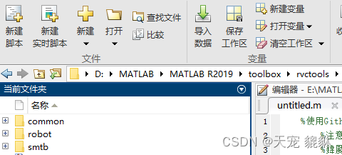 git clone https://github.com/petercorke/robotics-toolbox-matlab.git robotgit clone https://github.com/petercorke/spatial-math.git smtbgit clone https://github.com/petercorke/toolbox-common-matlab.git common下载完成你的rvctools文件夹下会出现common、robot、smtb三个文件夹