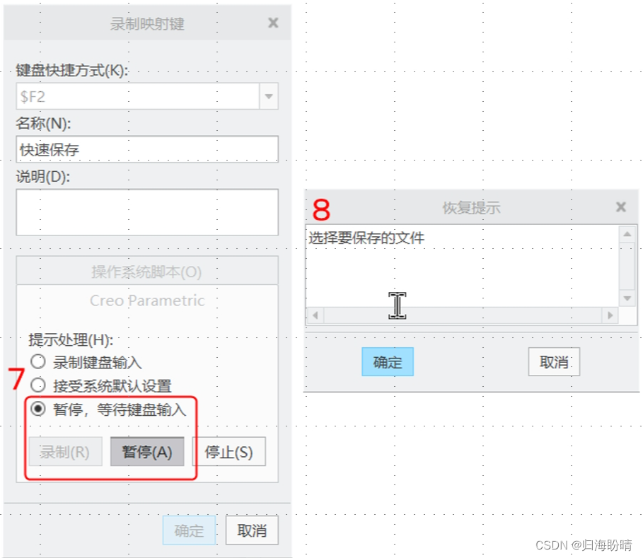 3.在录制过程中需要人为操作时,例如选择要保存的文件、输入保存路径等,可选择“暂停,等待键盘输入”,选择暂停,操作完成后恢复录制。此时也可以编辑 弹出窗口 ,提示所要进行的操作。