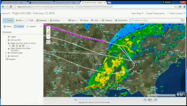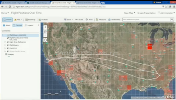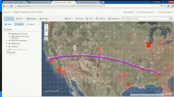 下面我们来看看大会现场的演示示例,使用的数据为旧金山到亚特兰大飞机航线数据,通过对大量航线数据分析来展示ArcGIS在大数据存储方面的能力,管理者认为历史数据有时候对分析事件、管理决策起着至关重要作用。