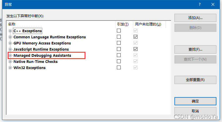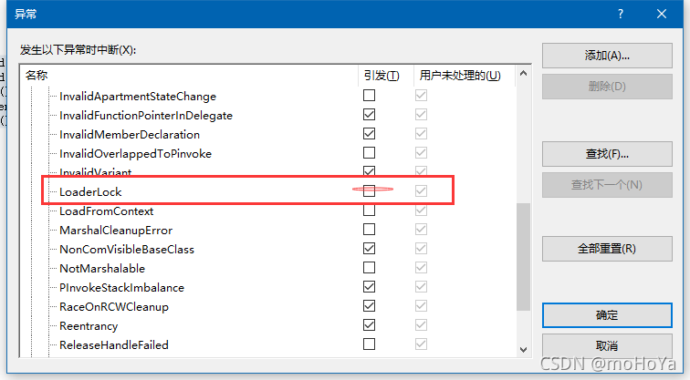 注意:调试重新异常 打开【异常】将【LoaderLock】方框内的✔取消