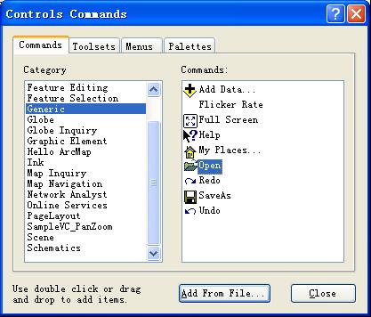 此时,工具条中还没有任何工具,添加的方法也很简单。右击ToolbarControl,选择“属性|Items”,点击Add,选择Commands选项卡中的Generic,双击Open、SaveAs、Redo、Undo即可将相应工具添加到工具条。