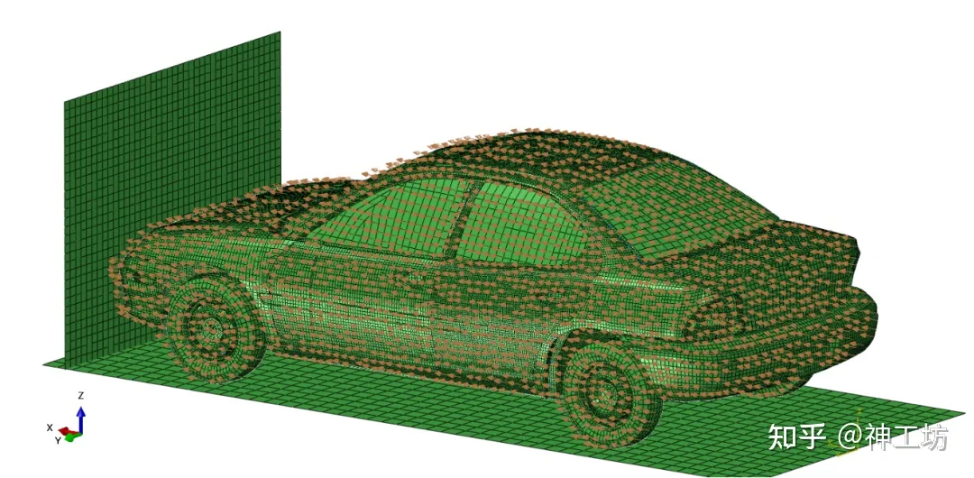 汽车、路面和墙体之间接触使用通用接触。定义墙体为刚体、路面为刚体。通过在墙体上定义RP点,将固定约束施加在RP点上使得墙体固定。汽车的初始速度为25mph,在车体上施加速度场,方向为X轴正方向。