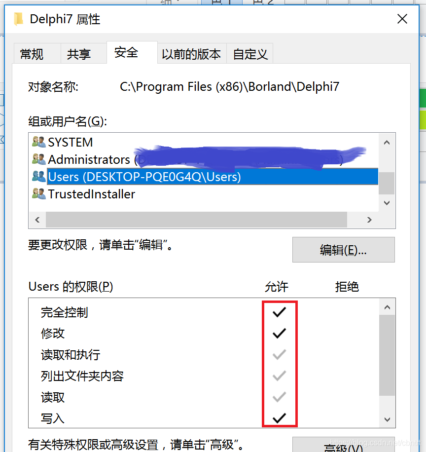 终极解决办法是:修改C:\Program Files (x86)\Borland 和 C:\Program Files (x86)\Common Files\Borland Shared 两个文件夹的Users组的访问权限为完全控制,然后卸载并重新安装delphi7即可:如下图