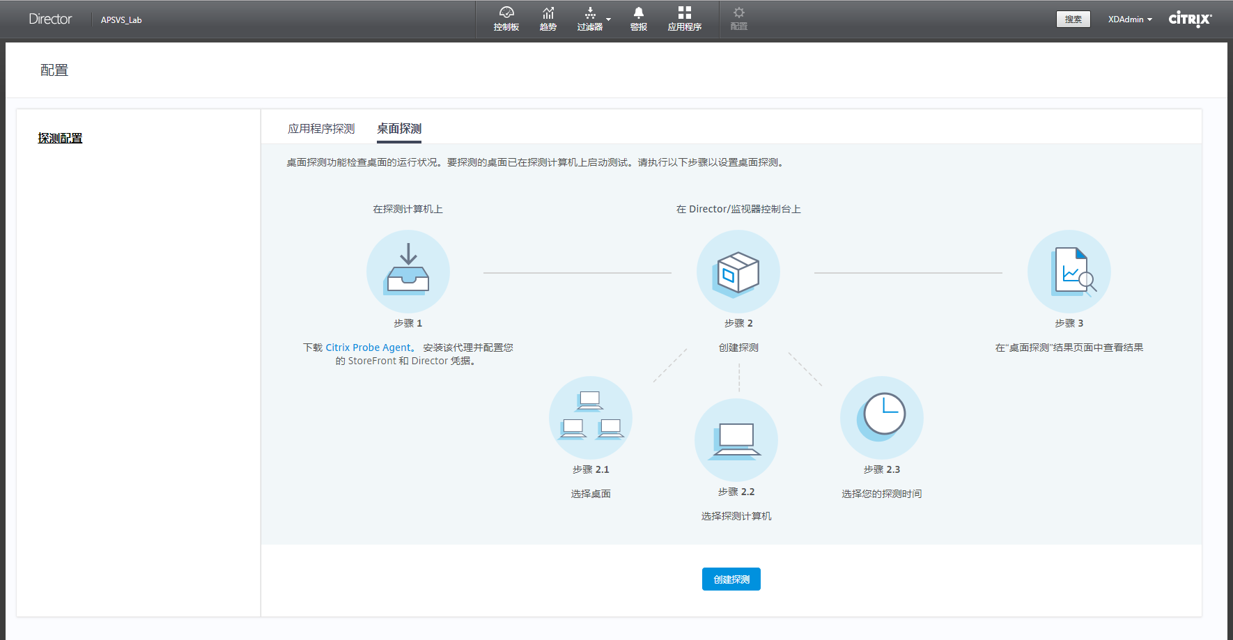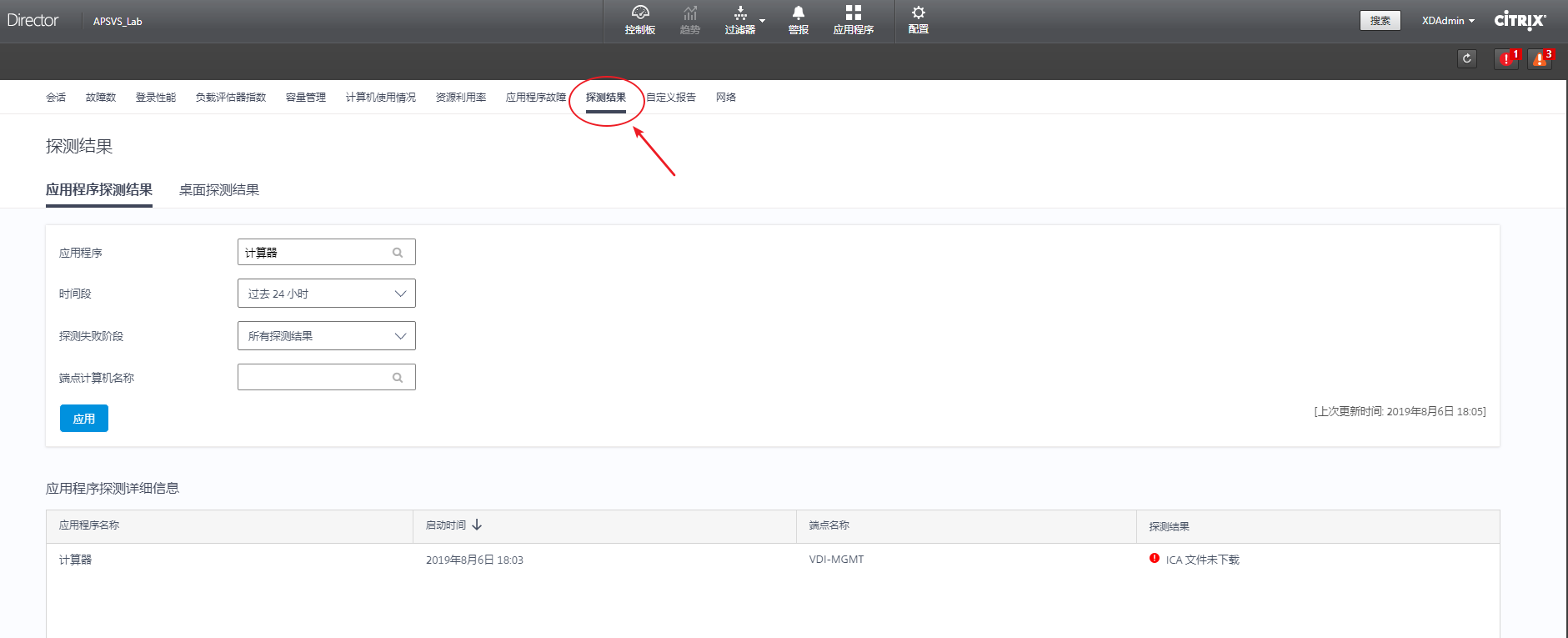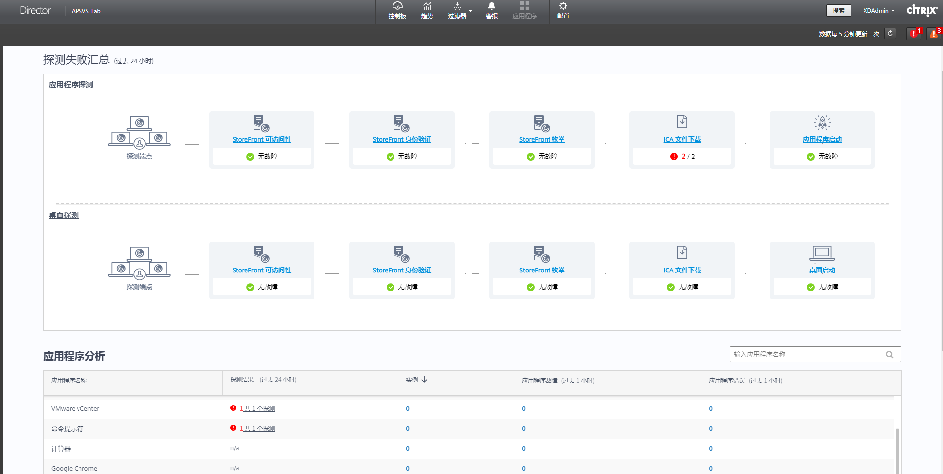 3.1、Citrix Probe至此配置完成,通过Director的”应用程序“页面可以查看探测结果