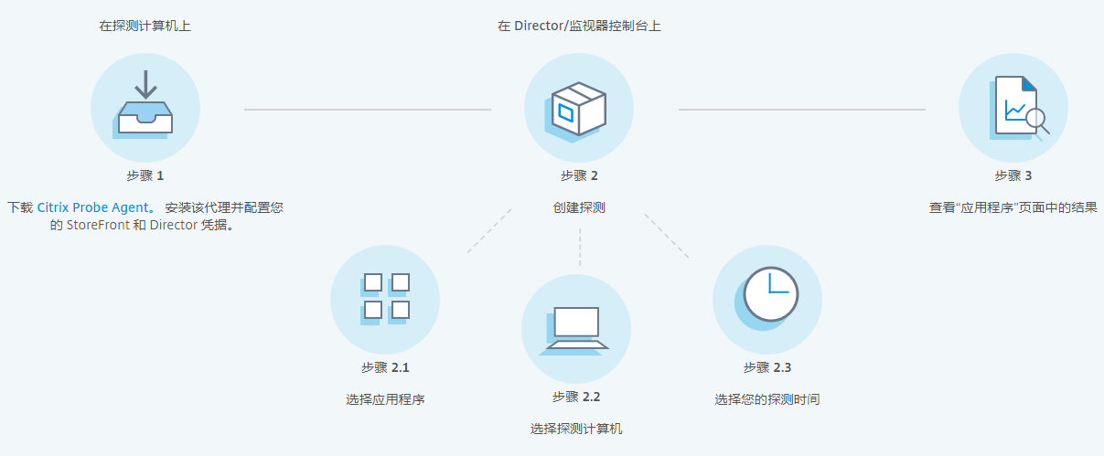 Citrix Prob服务通过在客户端计算机安装的Citrix Prob Agent静默执行模拟用户连接桌面或应用的过程,当模拟连接出现故障后主动通过Director进行通知并给出故障点提示。