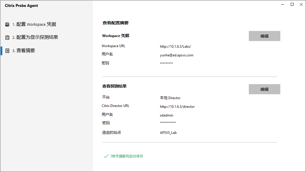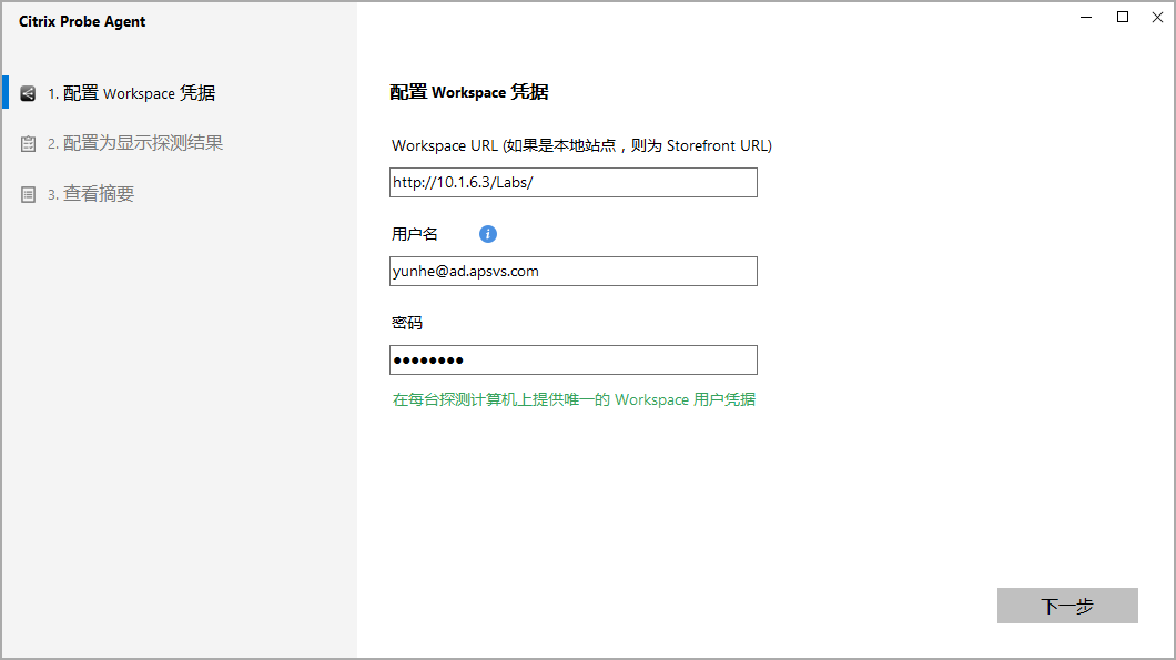 1.5、Citrix Prob Agent完成安装后,打开Citrix Prob Agent;在第一项 配置Workspace凭据中配置 Storefront的Receiver for Web地址,如果通过Citrix Gateway(Netscaler)登录需要Citrix Gateway 12.1或更高的版本;