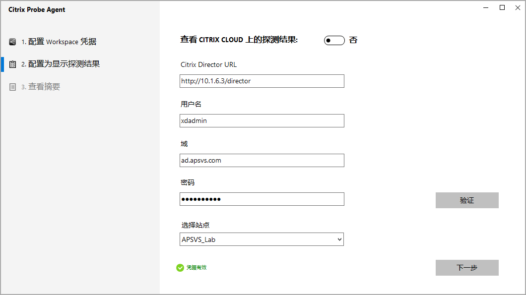 分别填入Director地址和Director凭据,然后选择Delivery Controller站点;