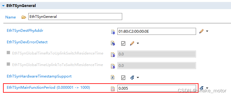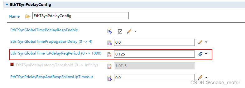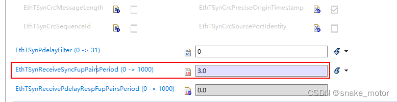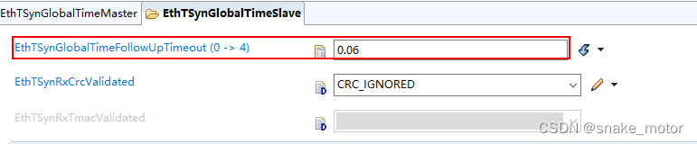 EthTSynGlobalTimeFollowUpTimeout , 此配置用于处理异常情况,对应代码内的变量是GlobalTimeFollowUpTimeout, 此配置的意思是,收到sync报文后,多长时间没有收到follow up 报文,则认为超时,后续即使再收到follow up, 也会丢弃掉此次follow up报文,需要等到下次再收到sync报文之后,才能继续处理follow up报文。
