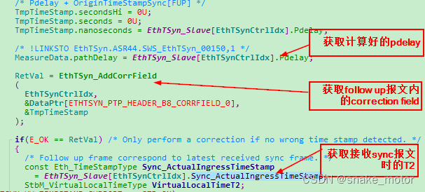 follow up报文在EthTSyn_ProcessRxSynFUpFrame 内处理,此函数比较复杂,涉及到的时间很多,并且会在此函数内,通过EthIf_SetGlobalTime 函数,修正本地时间与master时间的offset。