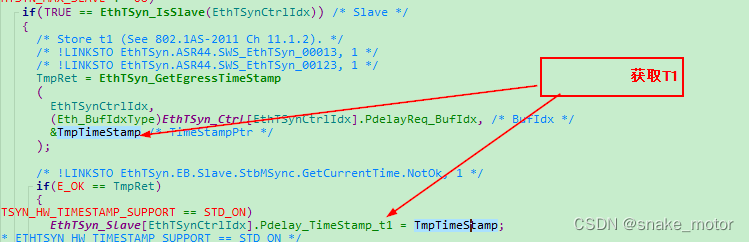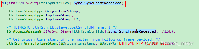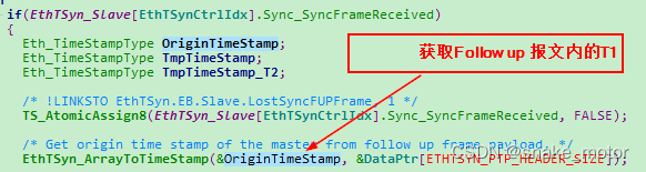 sync报文在EthTSyn_ProcessRxSyncFrame函数内处理,此函数中需要得到IngressTime,即T2,记录在EthTSyn_Slave[EthTSynCtrlIdx].Sync_ActualIngressTimeStamp 变量内。