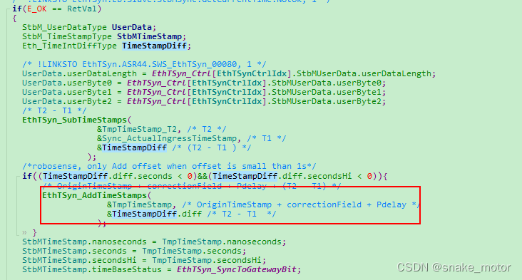 接下来就是计算本地时间与master时间的差值,并将最终计算出来正确的时间,通过EthIf_SetGlobalTime(EthTSynCtrlIdx,&TmpTimeStamp) 函数写入本地时间内