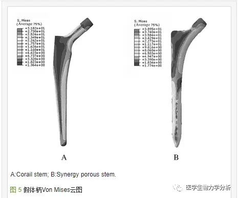 Corail型假体的应力分布较Synergy porous型假体更为均匀且无过多的高应力集中点,2种假体与股骨接触拐角处及其远端1/3处为最大应力集中区,Corail型假体最大应力为31.82 MPa,Synergy porous型假体最大应力为38.95 MPa。假体柄Von Mises云图见图 5。