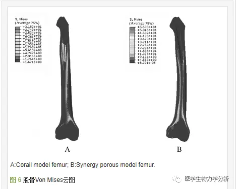 2种模型下的股骨应力集中位置均为股骨远端1/3处与假体股骨接触位置,且Corail型假体股骨最大应力为31.82 MPa,Synergy porous型假体股骨最大应力较大, 为55.05 MPa。股骨Von Mises云图见图 6。