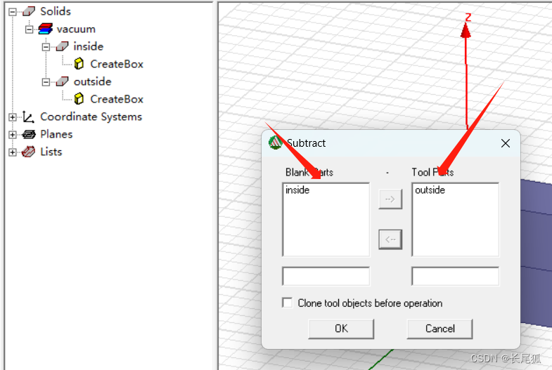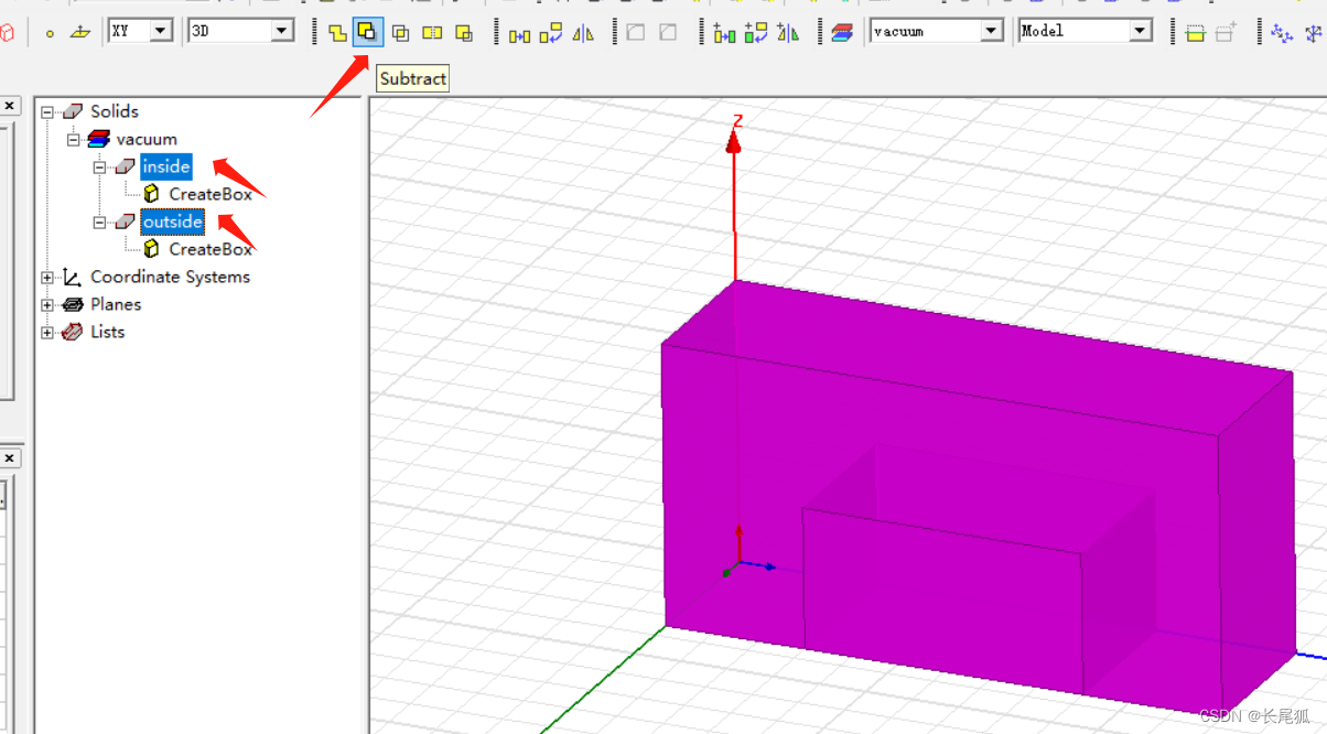 注意此处指定的顺序,左边的是外面的立方体,右边的是里面的立方体(空心),左边减去右边。