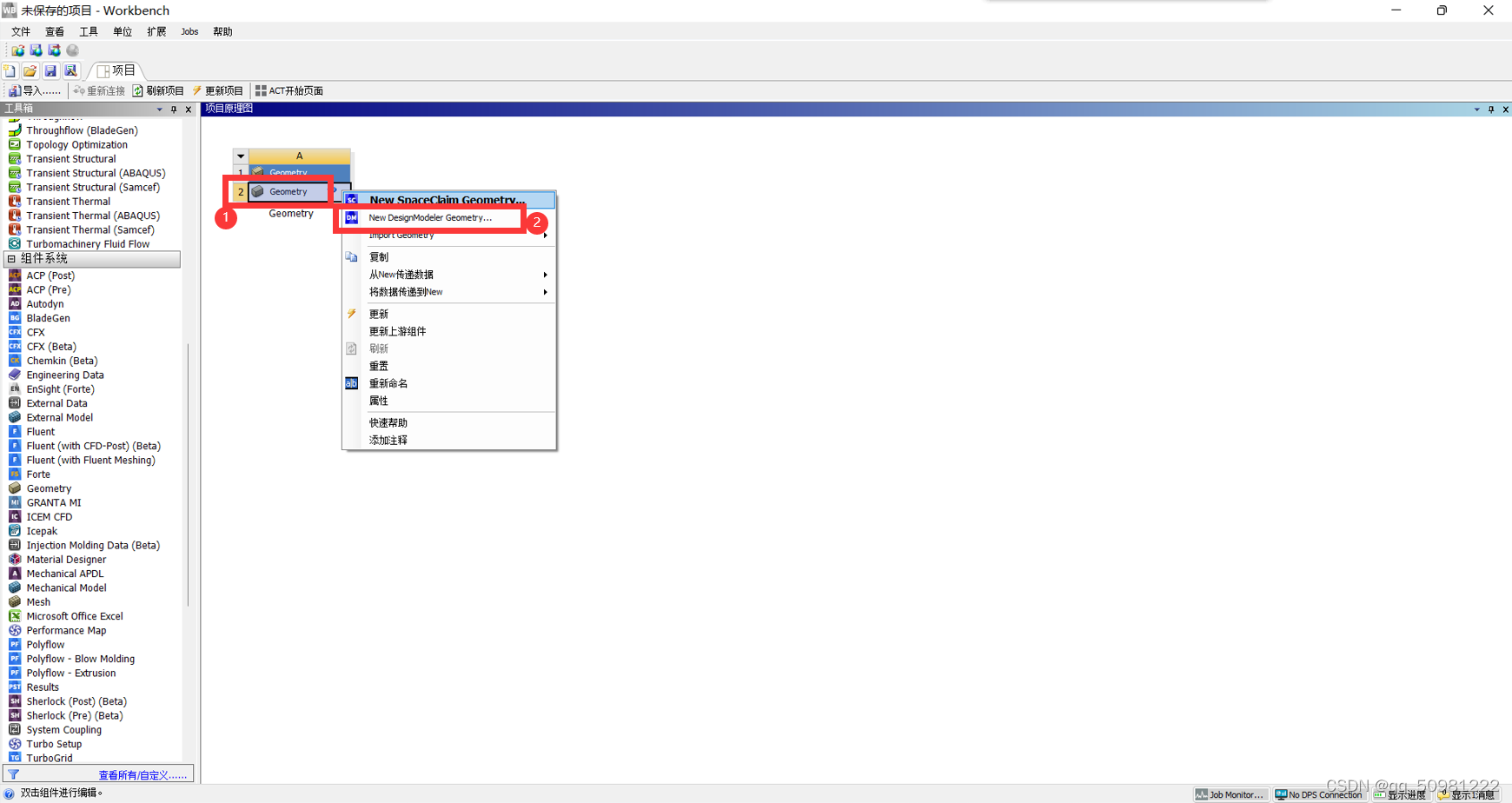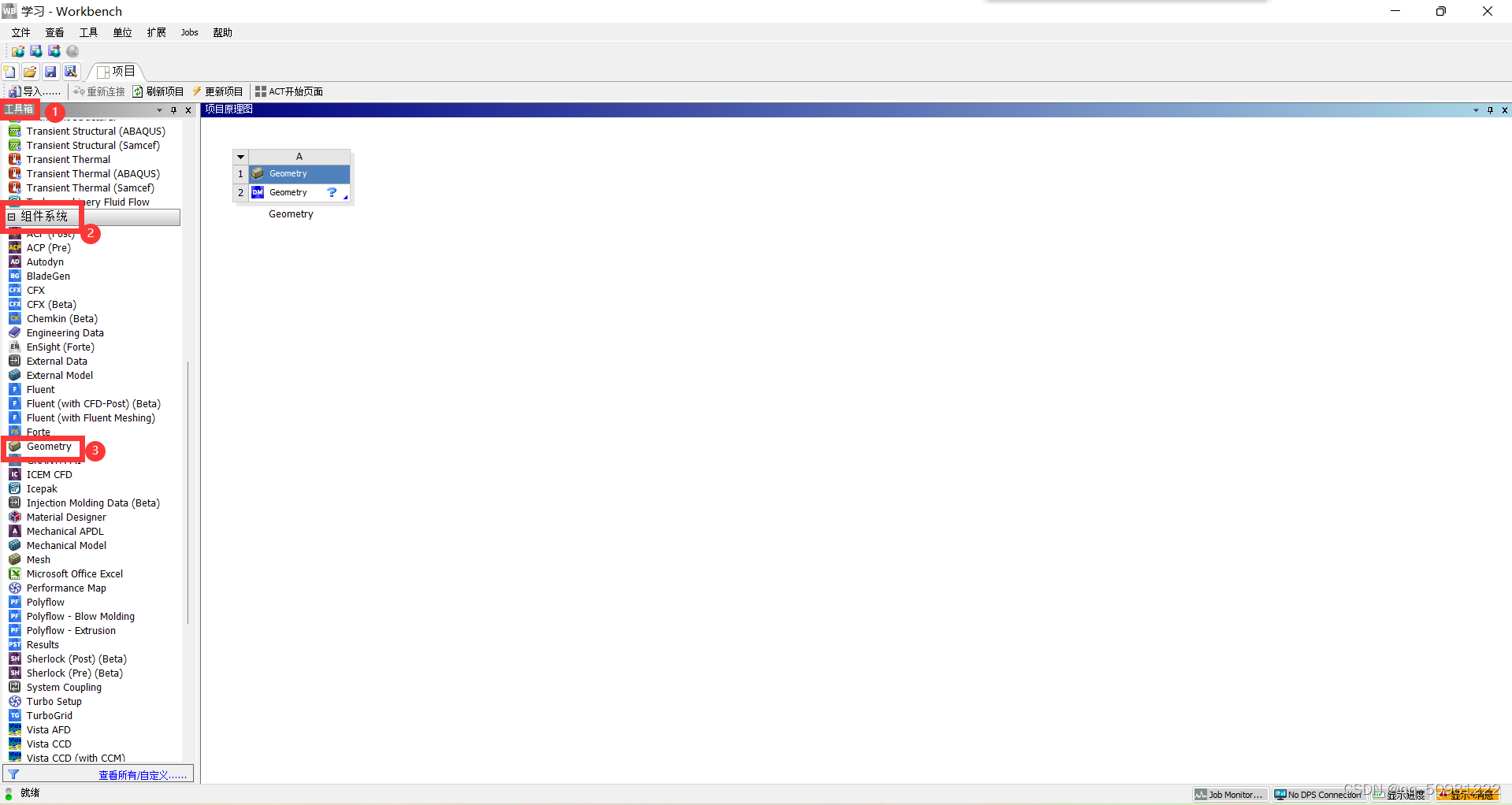 1.打开ANSYS 2020 R2 workbench,点击Toolbox(工具箱)—Component Systems(组件系统)—Geometry,在项目管理图窗格中显示如图 样式 。
