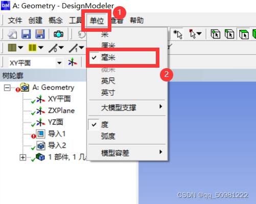 3.即可进入如图所示的DesignModeler平台界面。依次选择Units(单位)—Millimeters(毫米) 命令 ,完成单位设置。