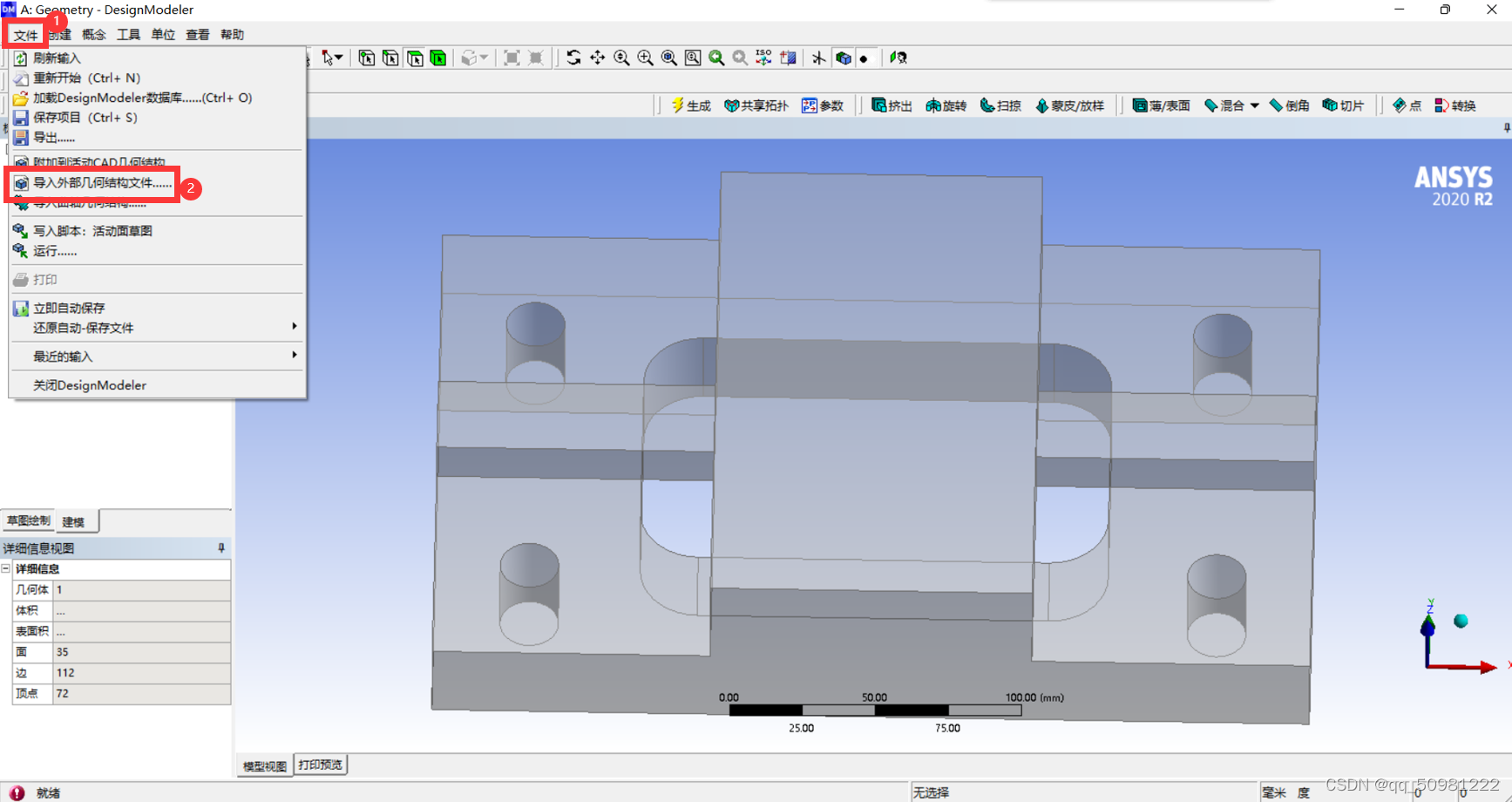 4.在DesignModeler平台界面依次点击File(文件)—import external geometry file...(导入外部几何结构文件...)。