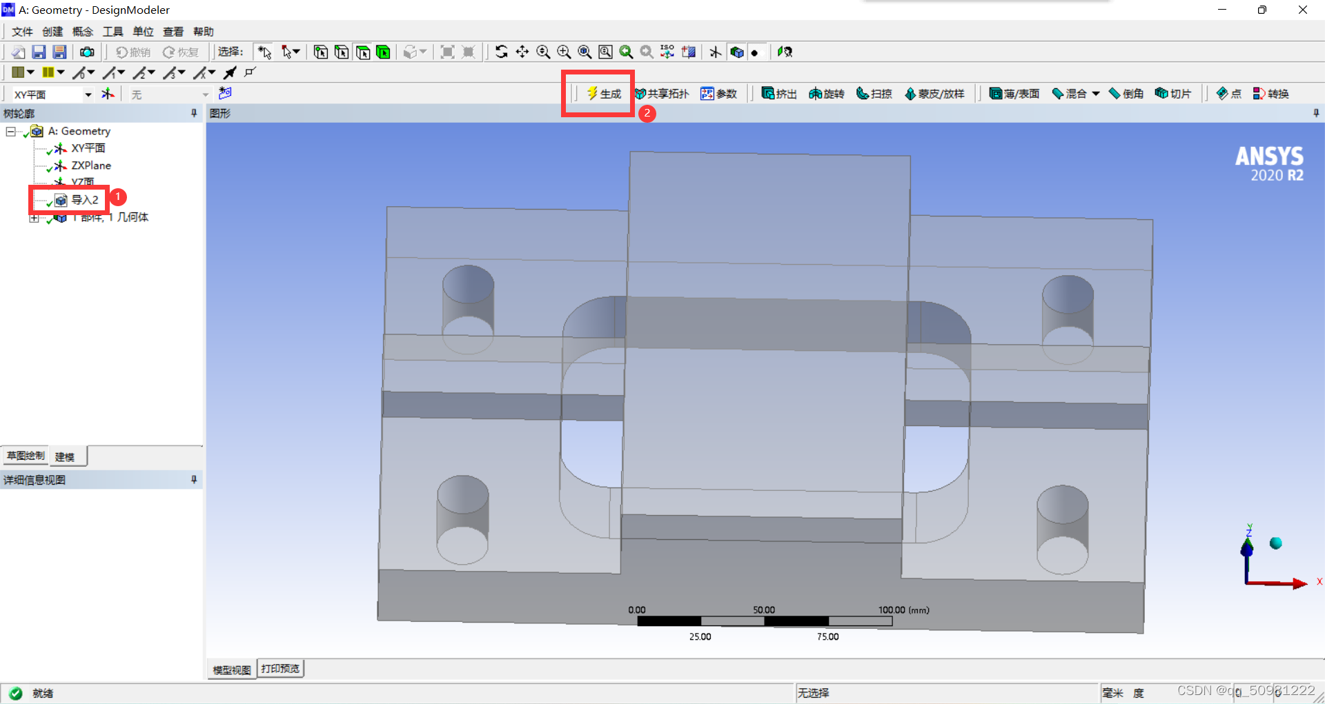 6.返回DesignModeler平台界面,此时已经出现import(导入2)文件了,再点击generate(生成),生成几何文件,导入外部几何完成,如图所示。