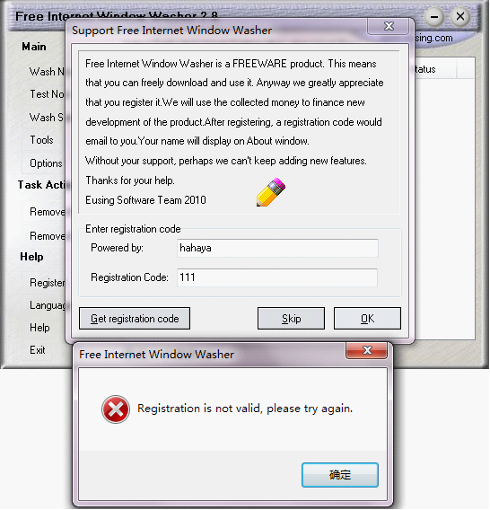 打开软件,会提示注册,随便输入授权人和注册码,会提示如下错误